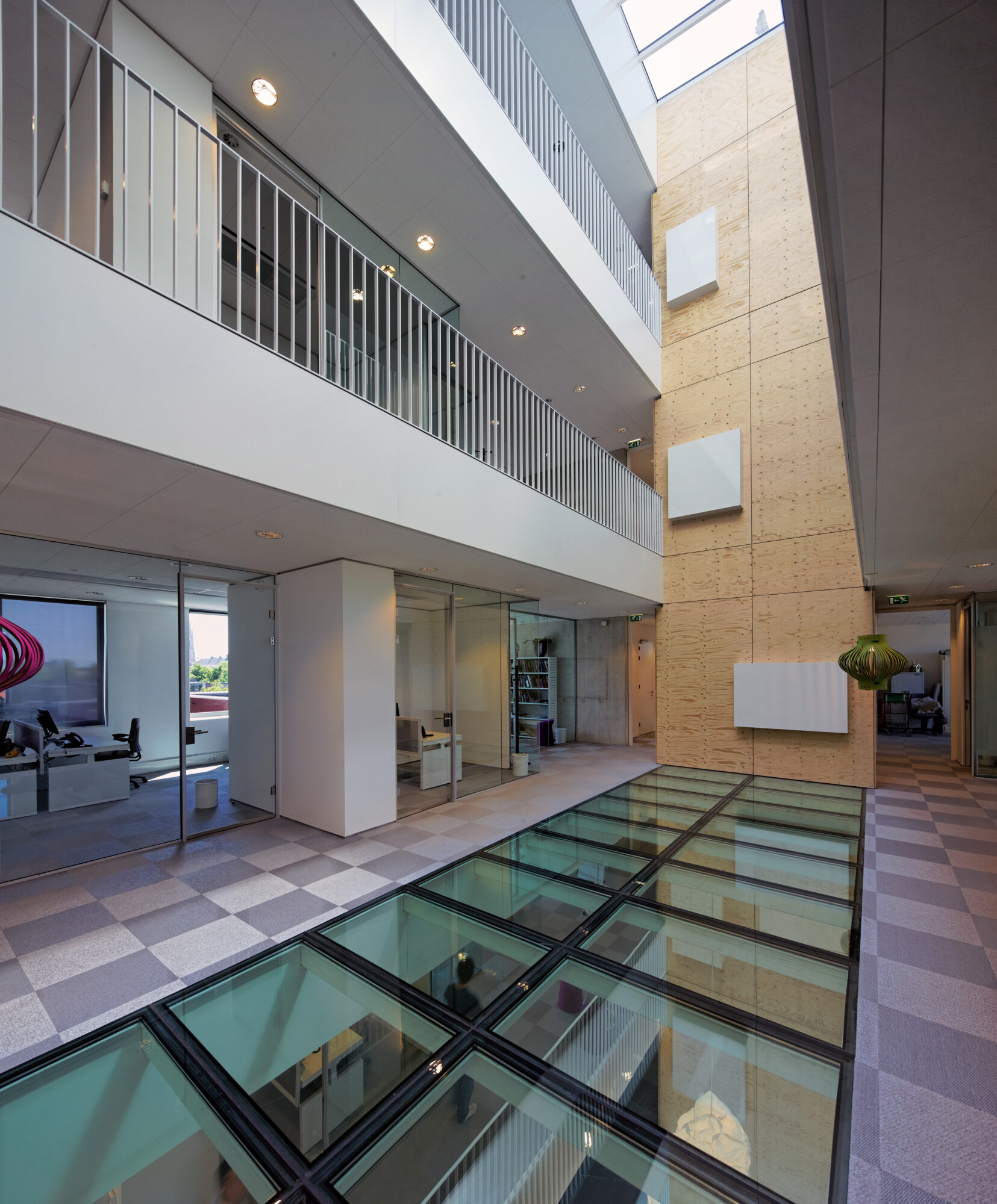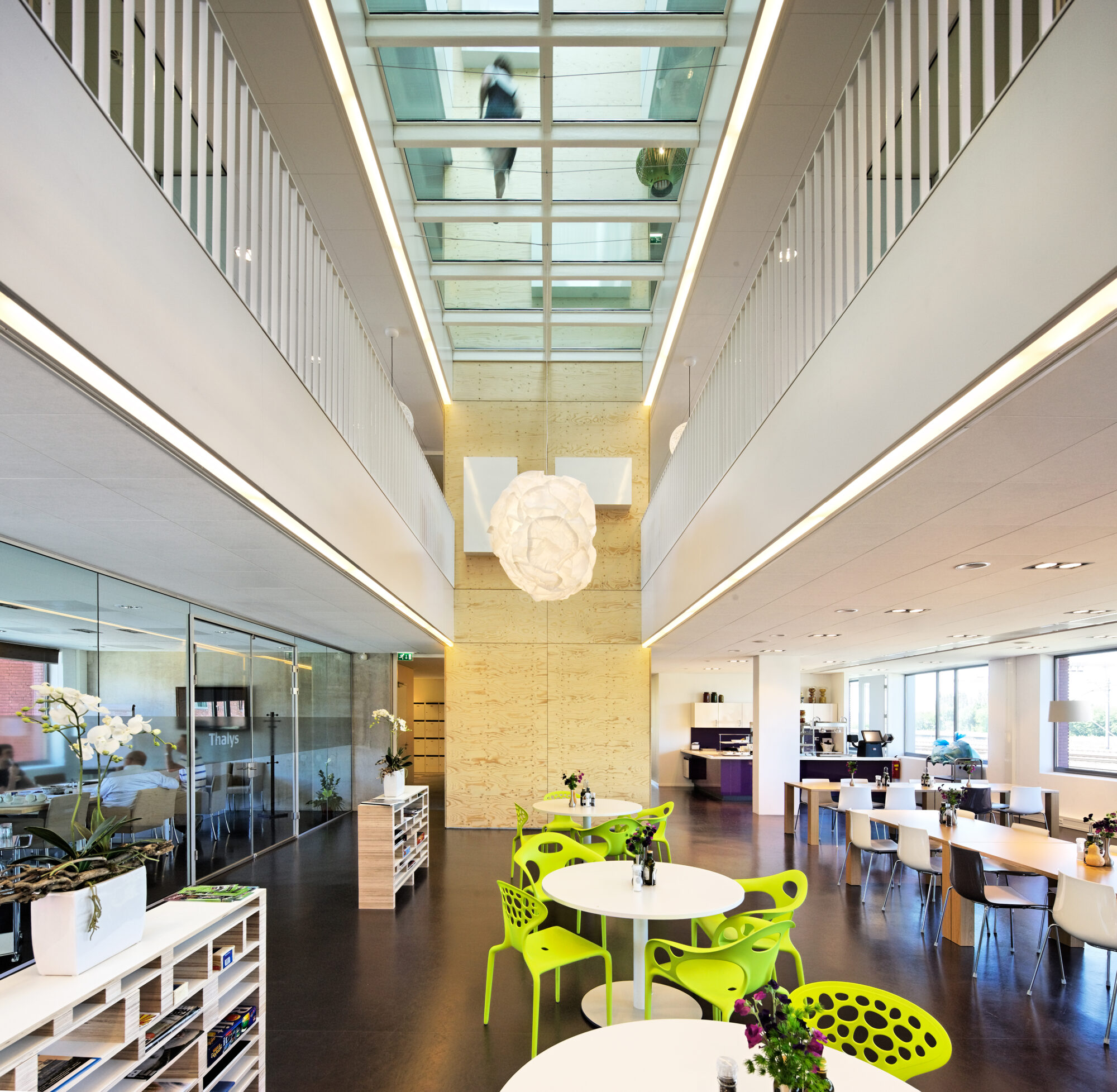 Bijkomend voordeel is dat aan praktisch alle gevels de mogelijkheid ligt om kantoorruimten te realiseren. Samen met de grote puien geeft dit het gebouw een open karakter en veel lichtinval. De kozijnen zijn zo opgedeeld dat deze de indelingsmogelijkheden van de ruimten niet in de weg staan.