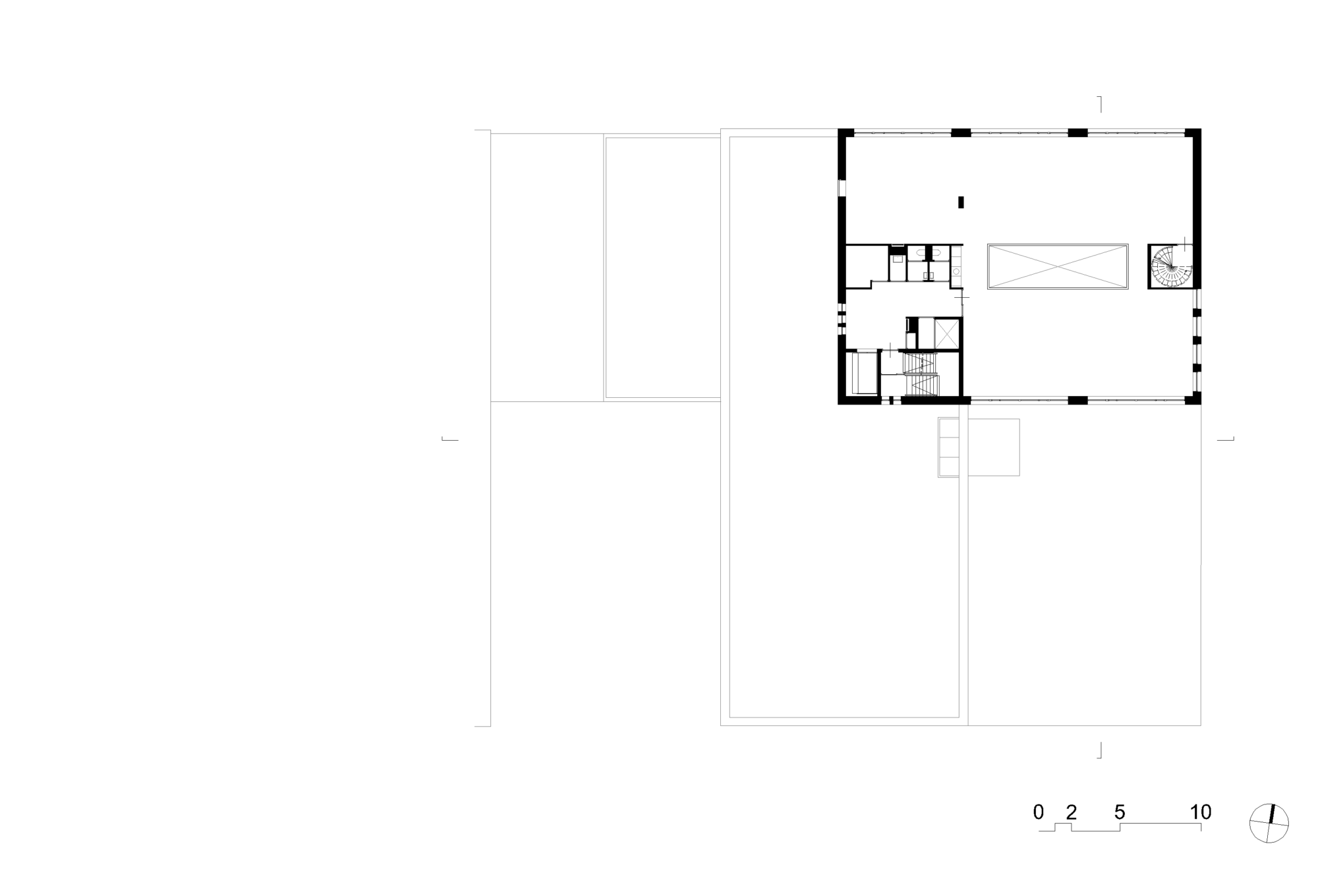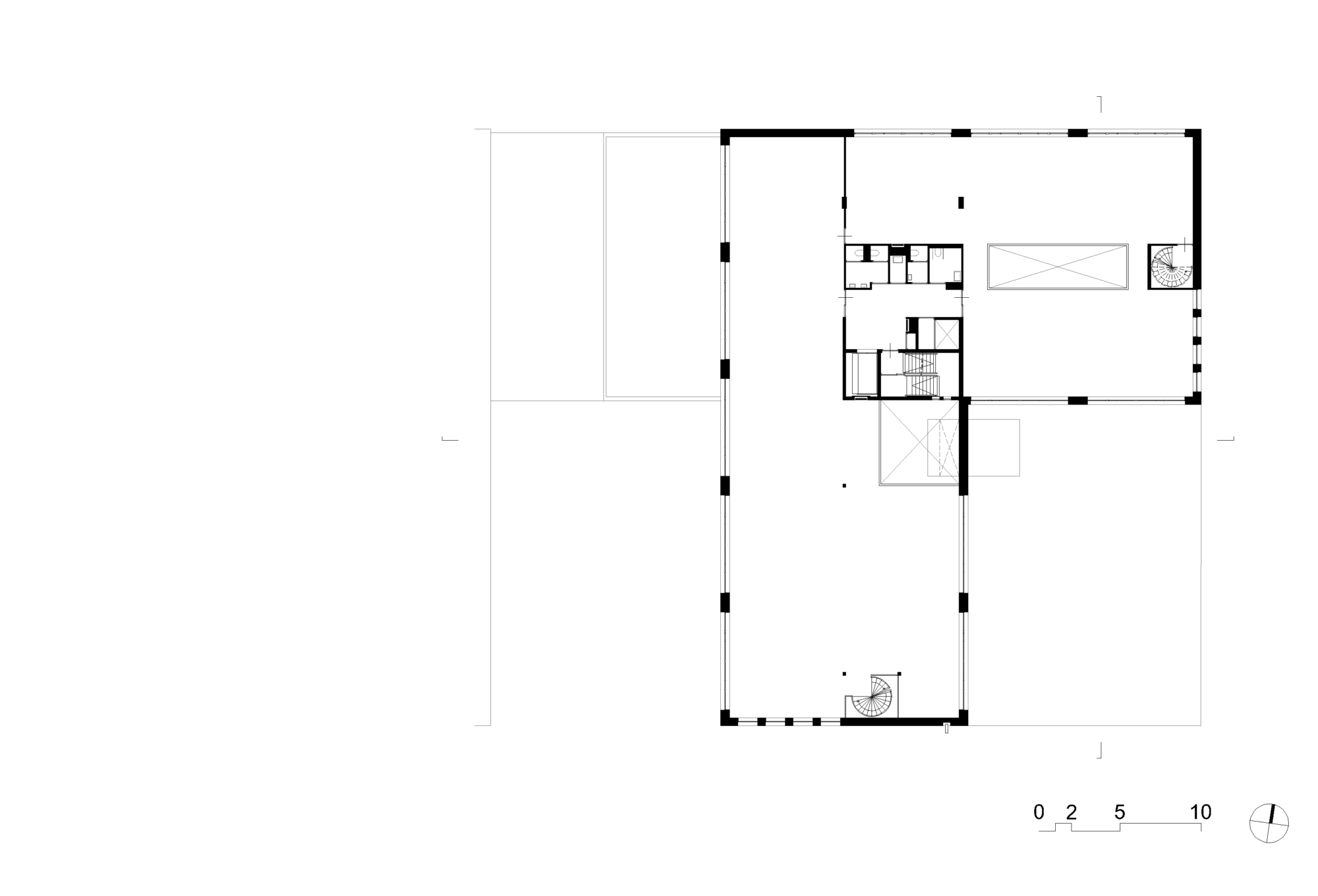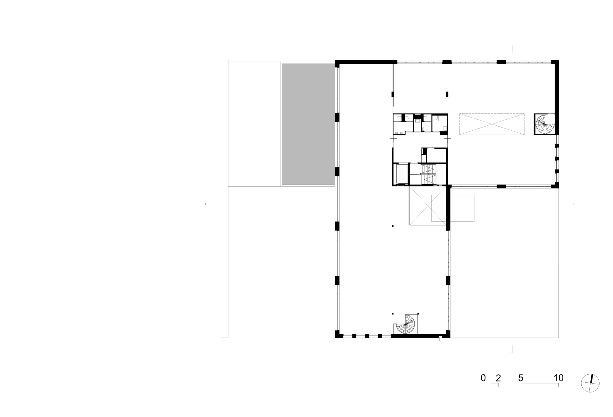 De breedte van de kelder is 16 meter, en leidt tot een aangename overmaat in de middenzone van het gebouw. Deze is nu ingevuld met vides, sanitaire groepen, pantry’s en zitgelegenheden, maar zou ook met vloeren verdicht kunnen worden. De lichte ruimte geeft het interieur een dynamisch karakter, met de gelegenheid tot informeel ontmoeten in het hart van het gebouw.