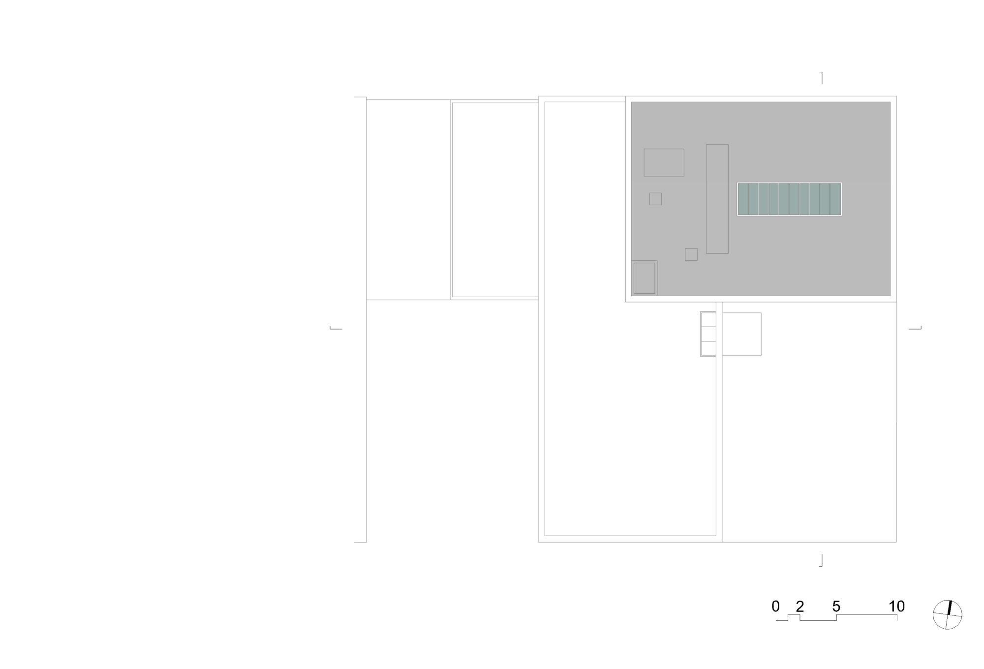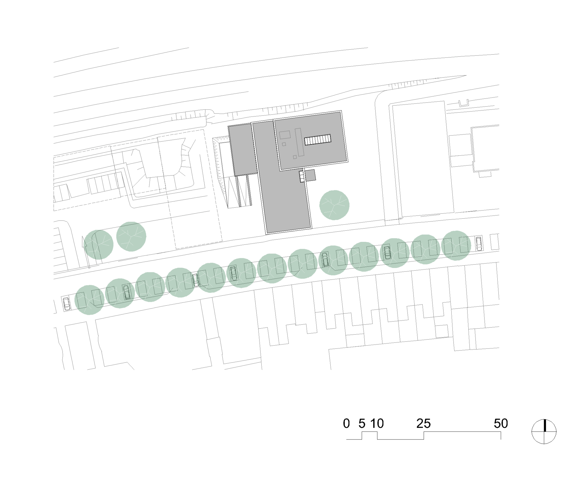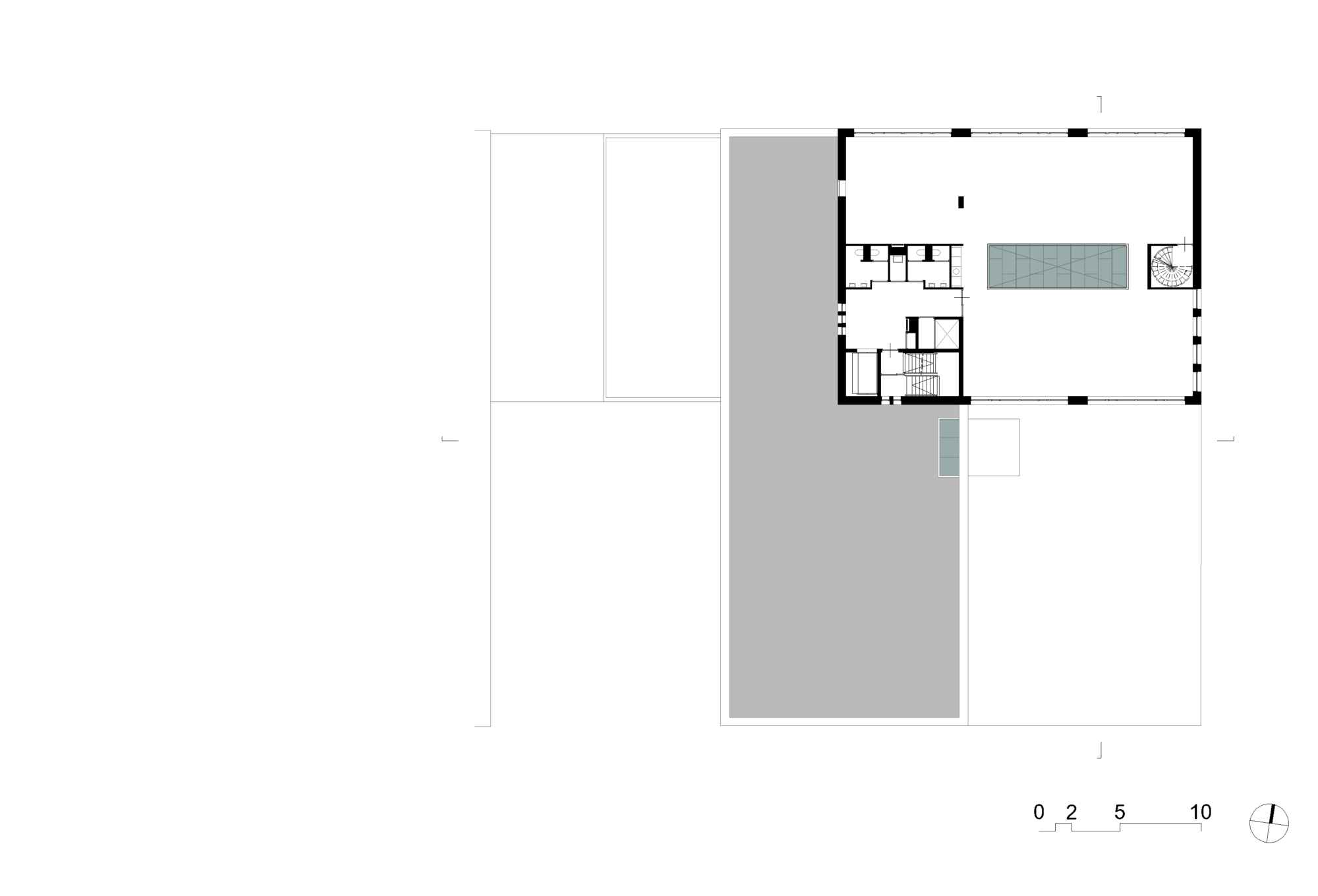 De breedte van de kelder is 16 meter, en leidt tot een aangename overmaat in de middenzone van het gebouw. Deze is nu ingevuld met vides, sanitaire groepen, pantry’s en zitgelegenheden, maar zou ook met vloeren verdicht kunnen worden. De lichte ruimte geeft het interieur een dynamisch karakter, met de gelegenheid tot informeel ontmoeten in het hart van het gebouw.