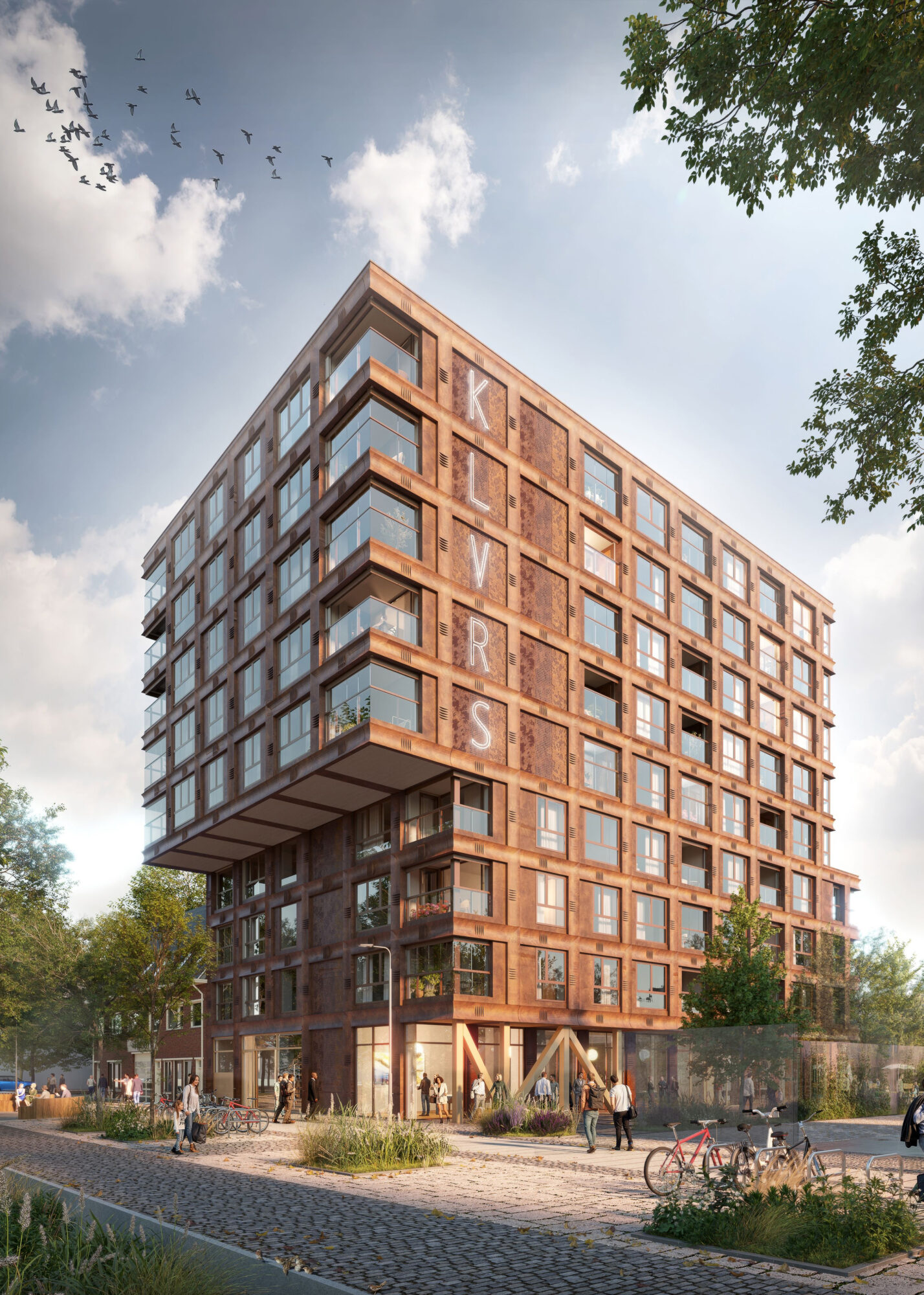 Dichterbij wordt ook de bijzondere gevel die door Bureau Fraai is ontworpen zichtbaar. Holle Corten-stalen schalen geven het gebouw een letterlijk en figuurlijk ongepolijste expressie die herinnert aan de conservenblikken die hier werden gevuld. Bijzonder is dat het meest markante gebouw op de plek sociale woningbouw betreft. Die hebben stuk voor stuk een mooi perspectief op de stad en het Havenkwartier.