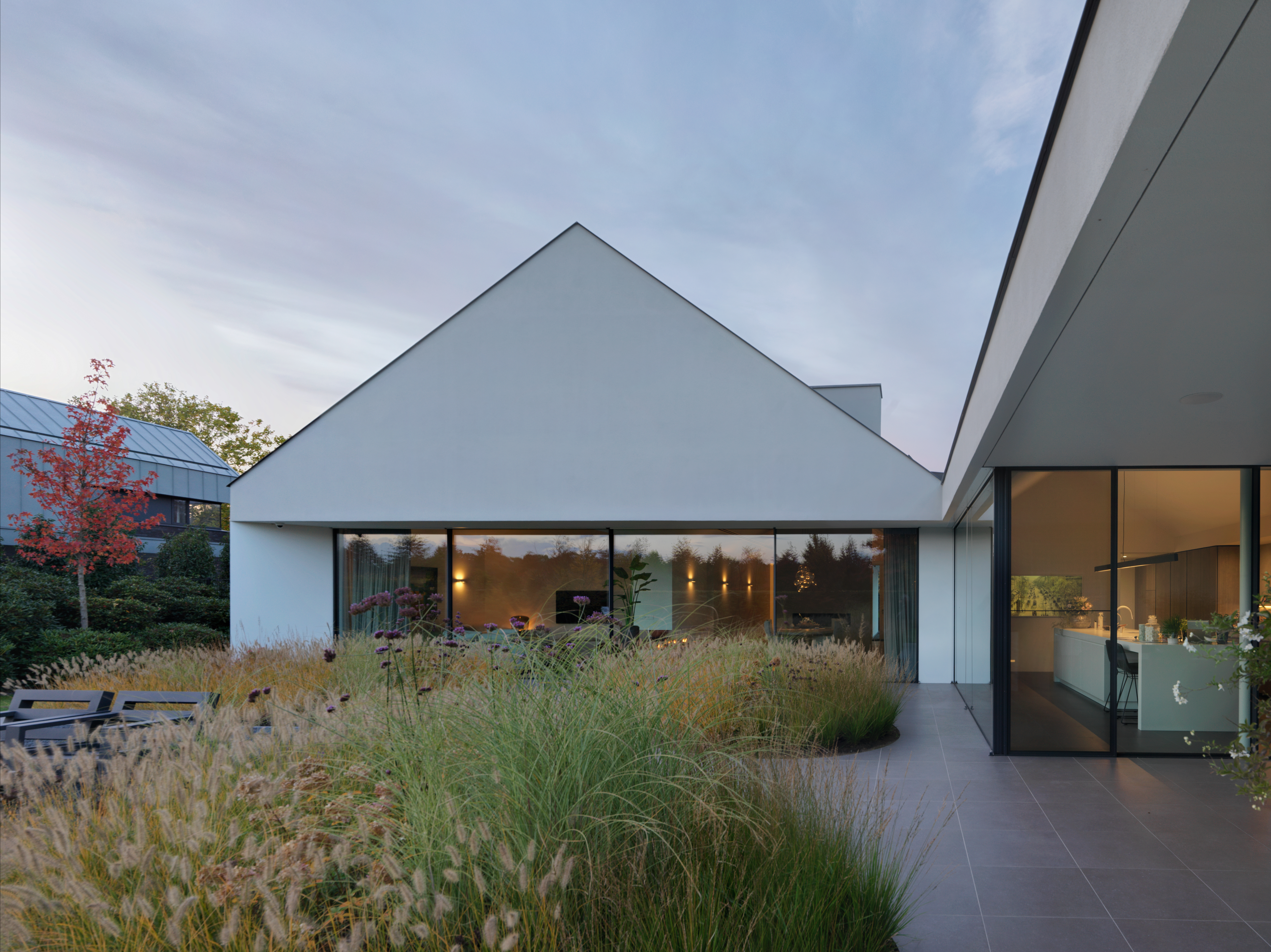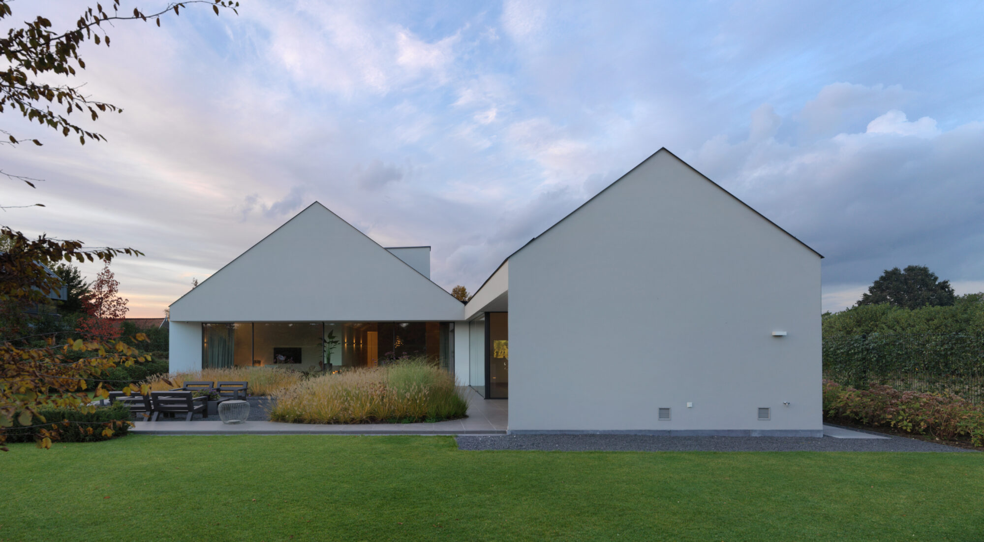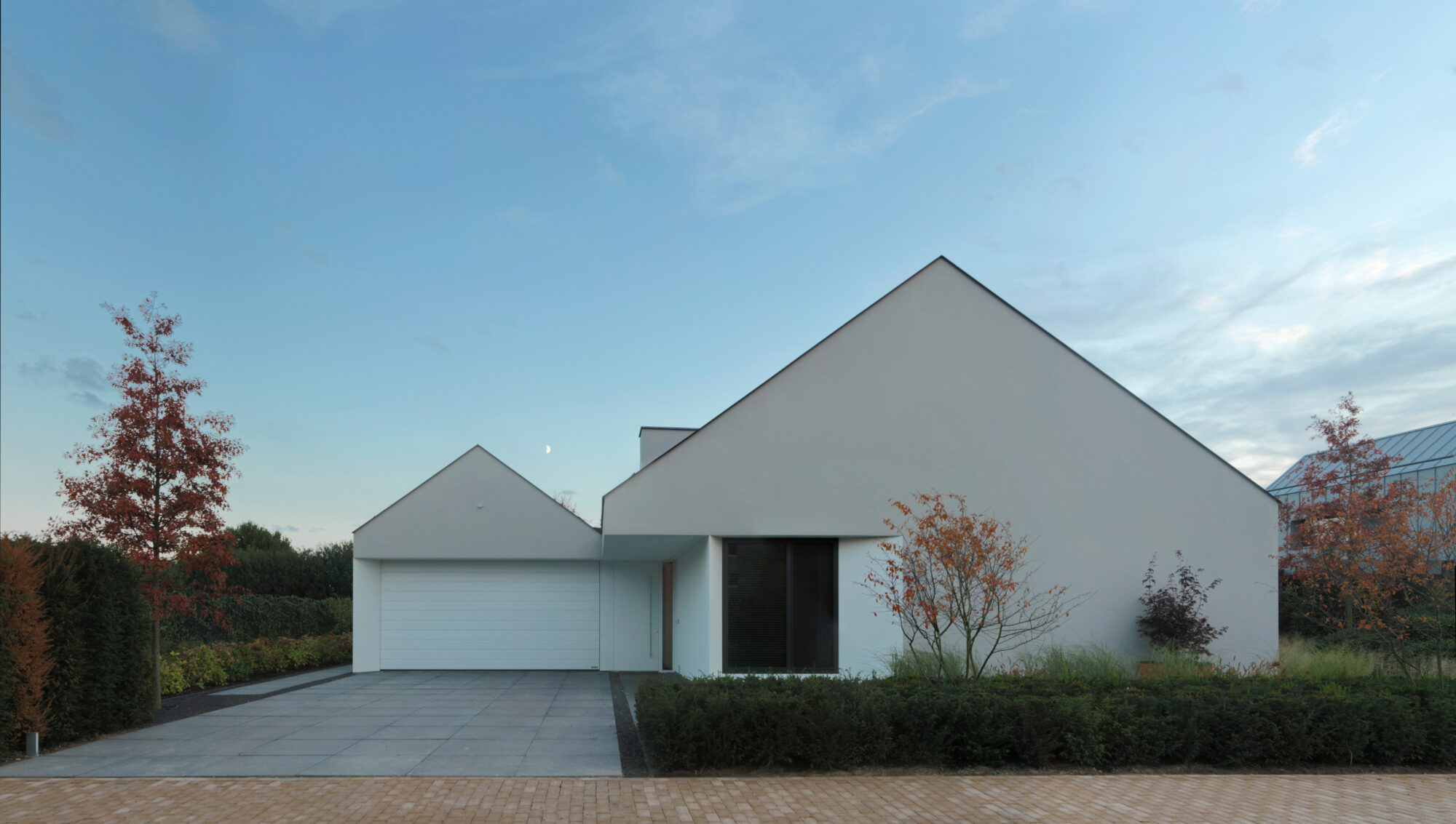 Op een perceel aan een besloten hofje in Oosterhout aan de achterzijde uitkijkend op het uitgestrekt groene landschap van De Heilige Driehoek is een éénlaagse, levensloopbestendige woning gerealiseerd. Een abstracte massa opgebouwd uit twee evenwijdige volumes met een archetypisch zadeldak.