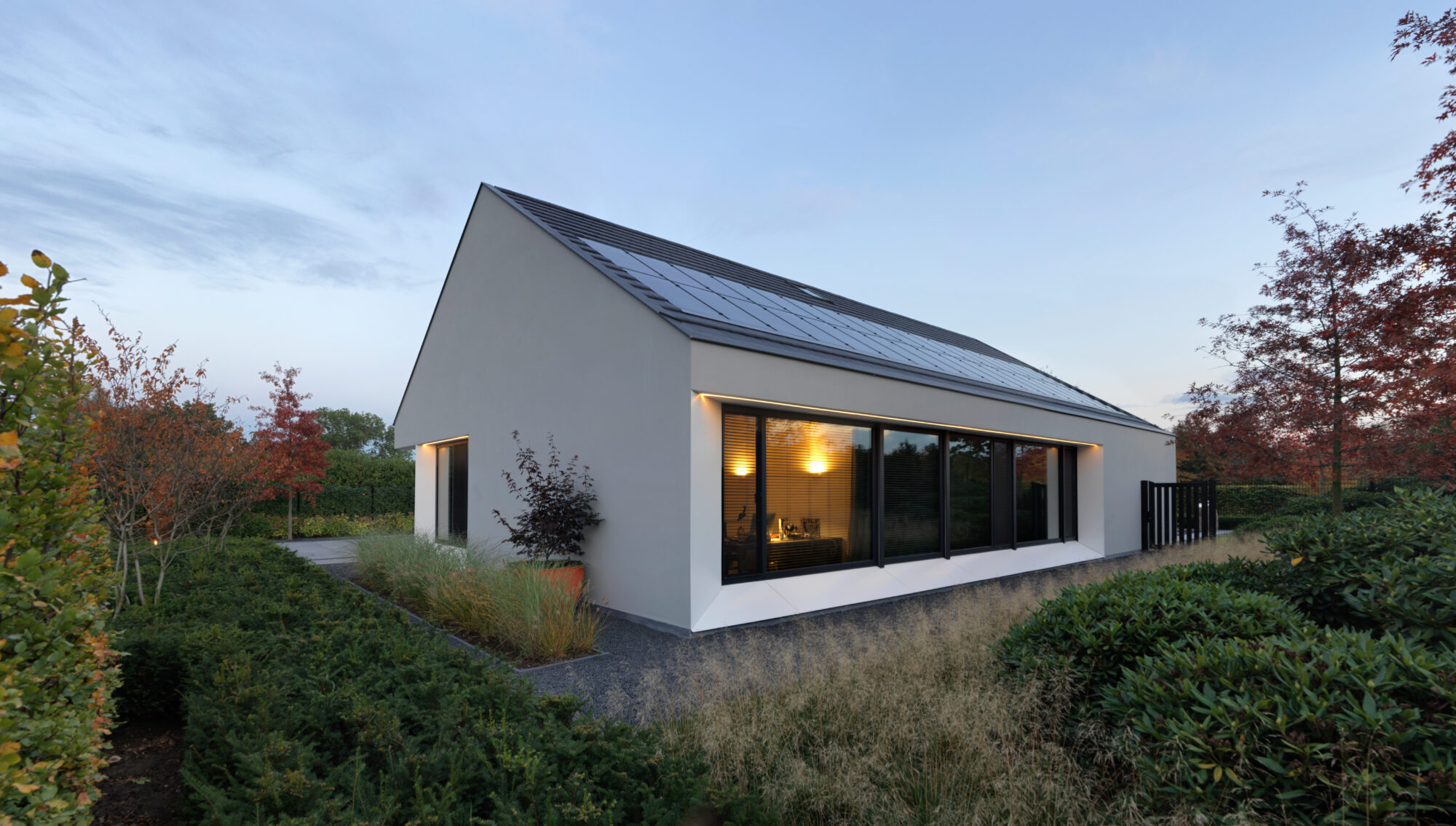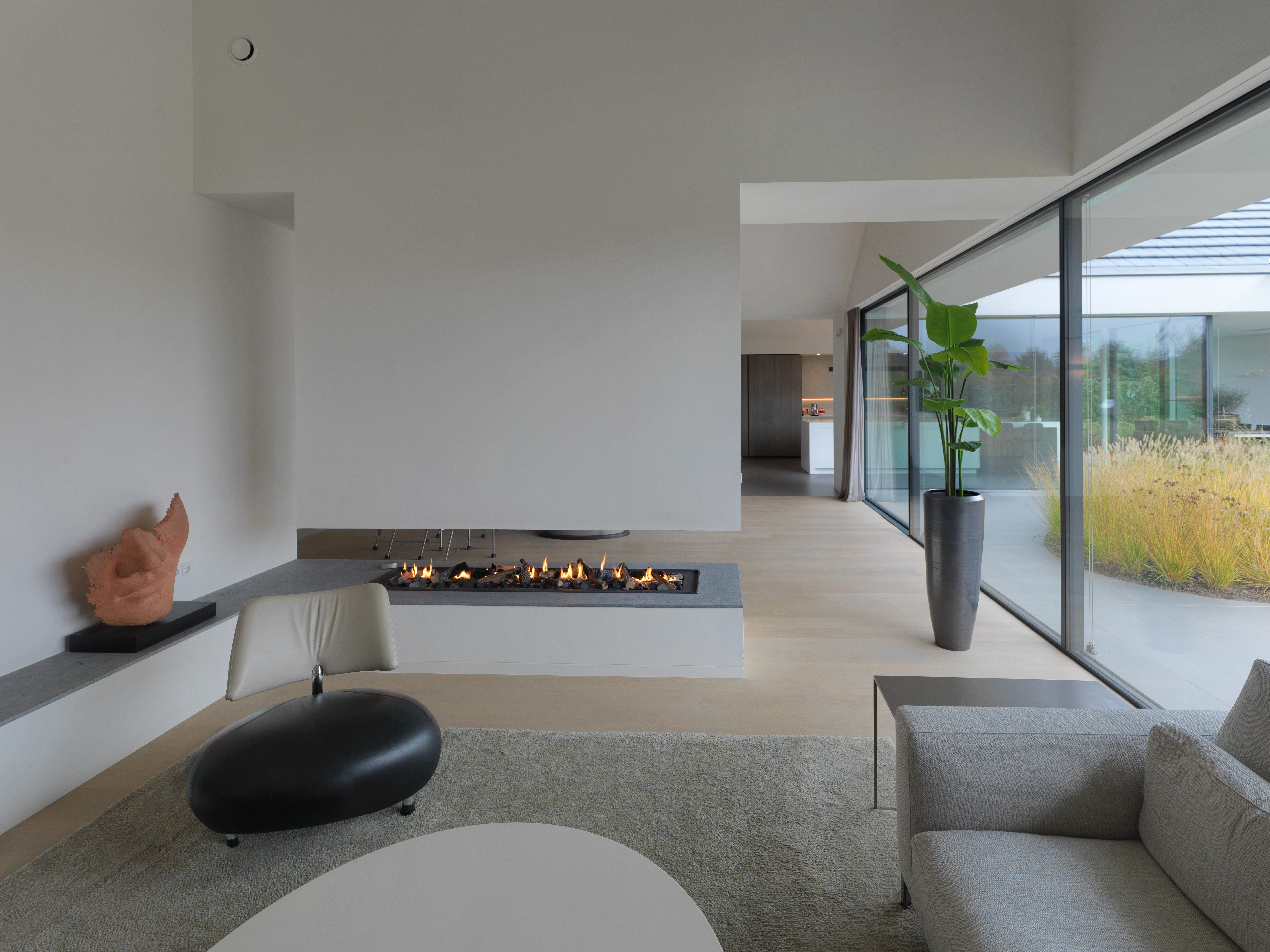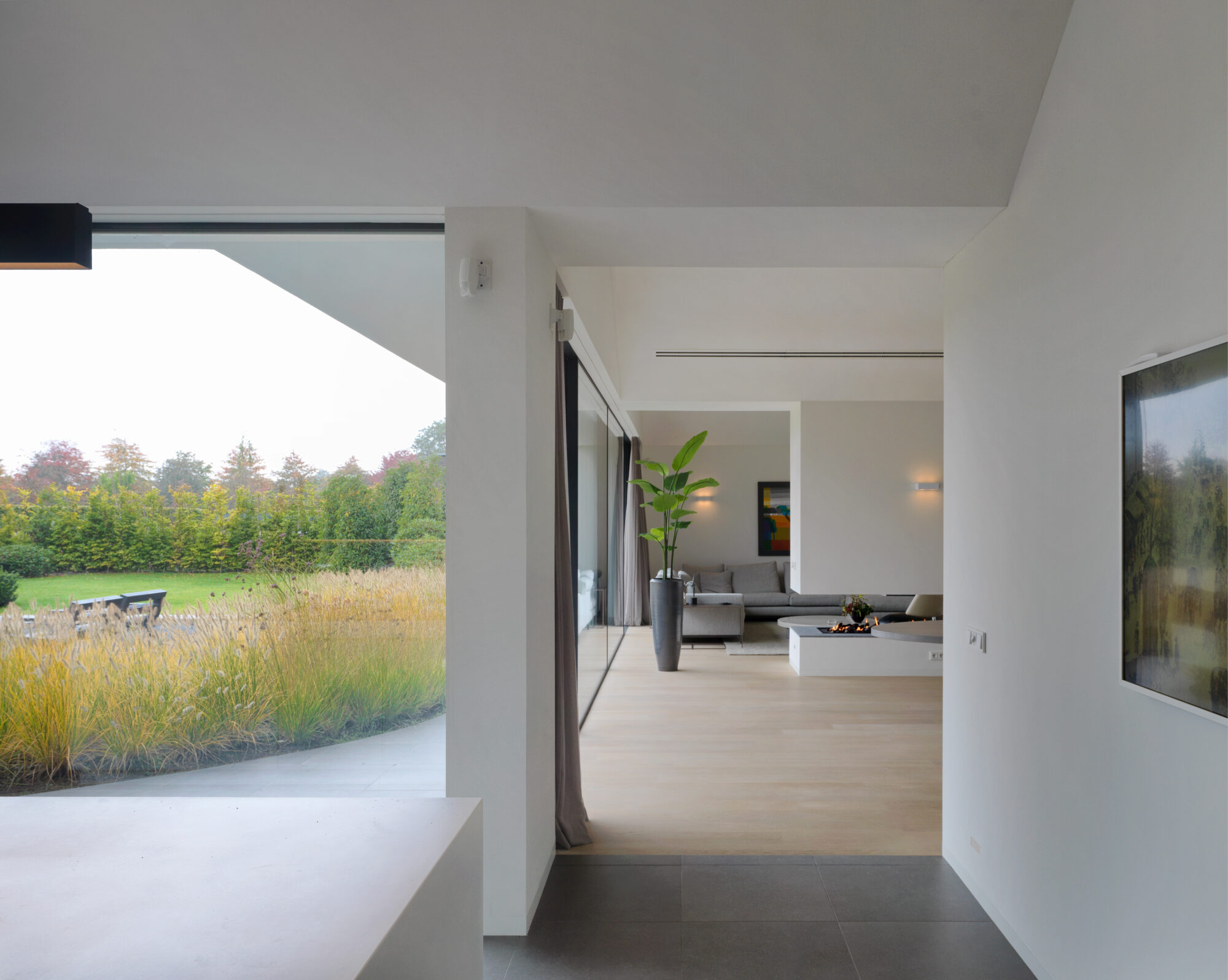 Op een perceel aan een besloten hofje in Oosterhout aan de achterzijde uitkijkend op het uitgestrekt groene landschap van De Heilige Driehoek is een éénlaagse, levensloopbestendige woning gerealiseerd. Een abstracte massa opgebouwd uit twee evenwijdige volumes met een archetypisch zadeldak.